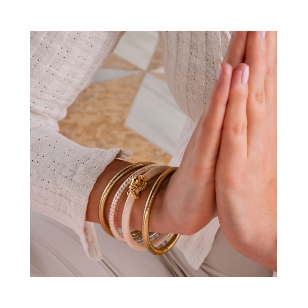 Crafted with the Mindful Glamour® and serene ritual you expect from BuDhaGirl, this unique stack serves as a beautiful, wearable reminder. Featuring a curated selection of All Weather Bangles® in bright reds accented with a touch of gold, paired with an exclusive beaded heart charm bracelet signifying heart health.