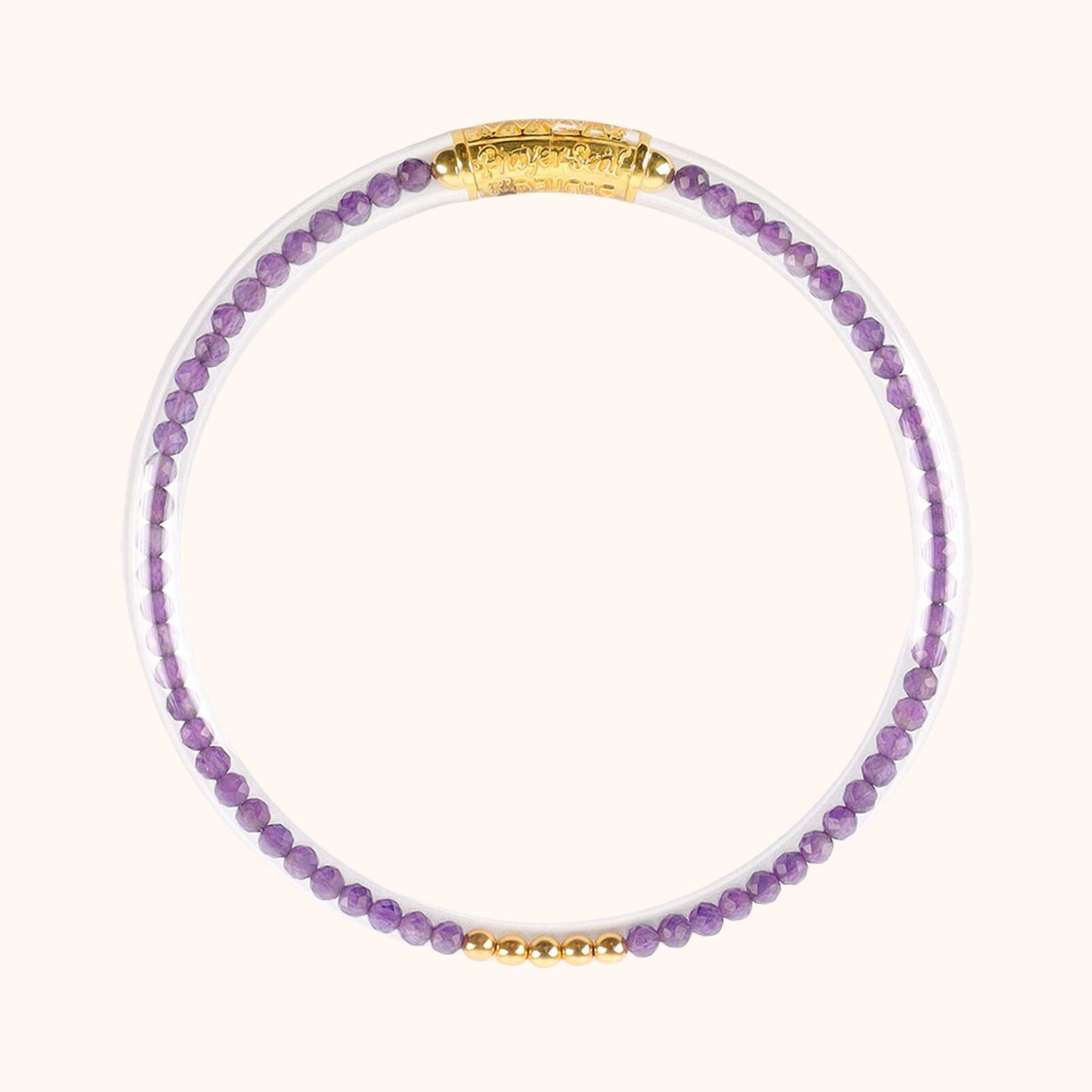 The Amethyst Luxe AWB has a strand of natural 2mm Amethysts totaling approximately 3.08 carats, the bangle is sealed with our Serenity Prayer Bead in 925 silver dipped in 18 carat gold.