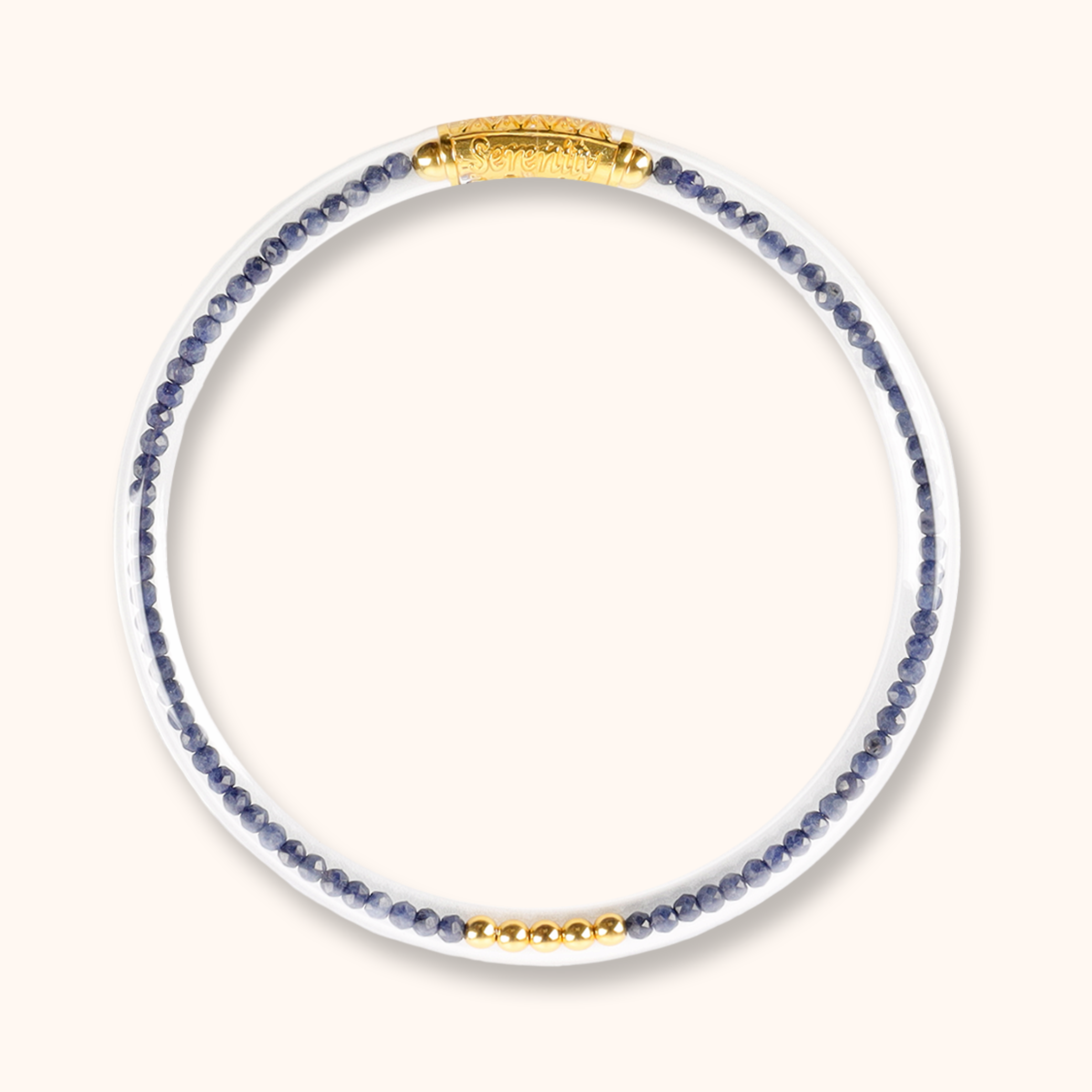 The Sapphire Luxe AWB has a strand of natural 2mm Sapphires totaling approximately 2.19 carats, the bangle is sealed with our Serenity Prayer Bead in 925 silver dipped in 18 carat gold.