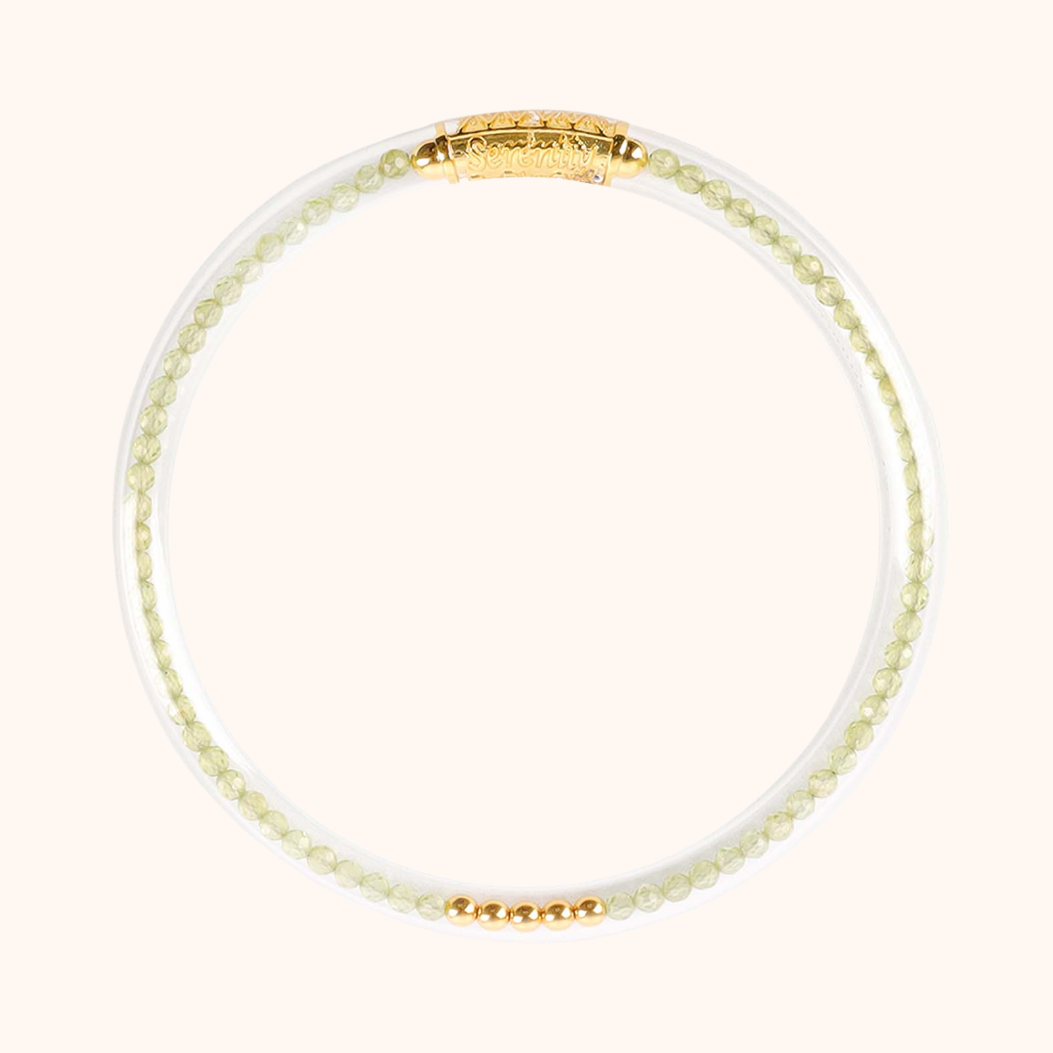 Le bracelet jonc BuDhaGirl Peridot Luxe Toutes Saisons est élégamment fabriqué par nos ateliers de haute joaillerie en Thaïlande. Des artisans expérimentés tournent et polissent la perle en argent sterling Serenity Prayer qui est ensuite plongée dans 3 microns d'or 18 carats. Entièrement fabriqué à la main, touché par plus de 10 artisans.