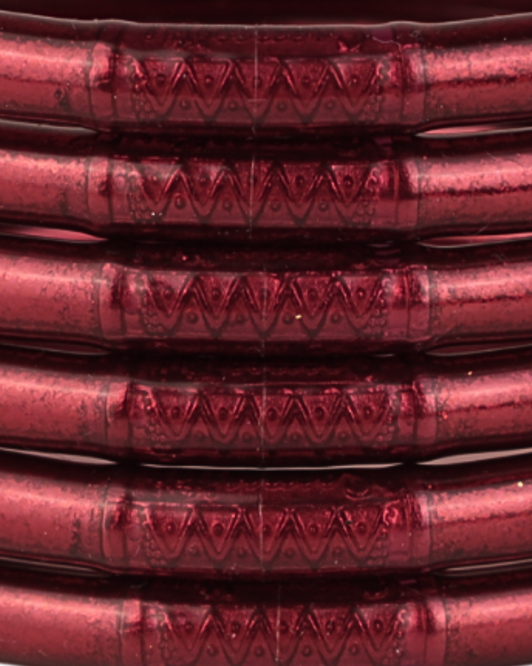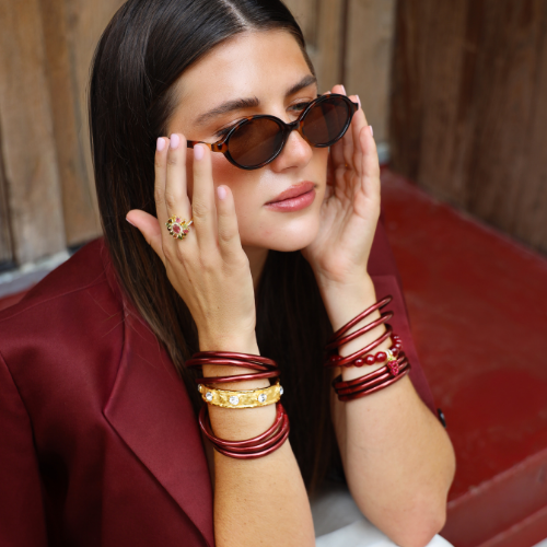 Rituale Mindful Glamour: Pausa. Respira. Indossa i tuoi Merlot All Weather Bangles concentrandoti sul raccolto del tuo viaggio e sulla ricchezza del diventare.