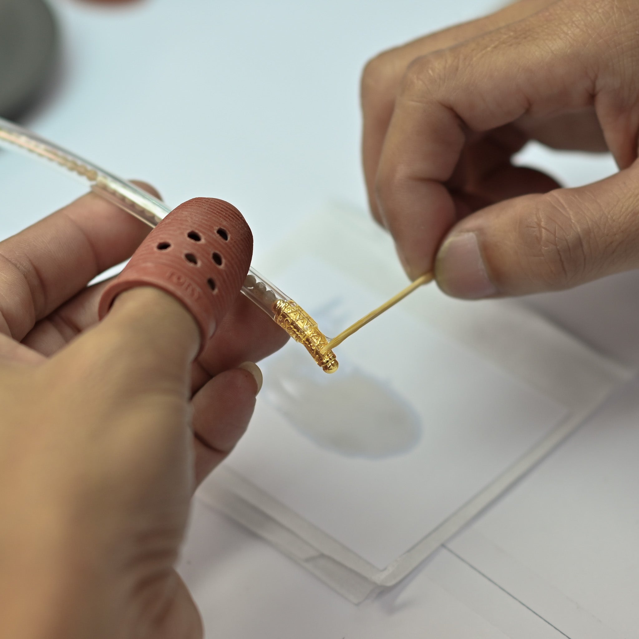 The next step is most delicate—the placement of the Serenity Bead—is done entirely by hand. Using a custom adhesive and a steady touch, the artisan secures the bead to the gold-infused tubing with care, intention, and reverence. This quiet moment of union brings together all the elements: Thai craftsmanship, fine jewelry, and ritual design. It is where form meets meaning, and where your All Weather Bangle® becomes whole—ready to carry your intentions into the world.