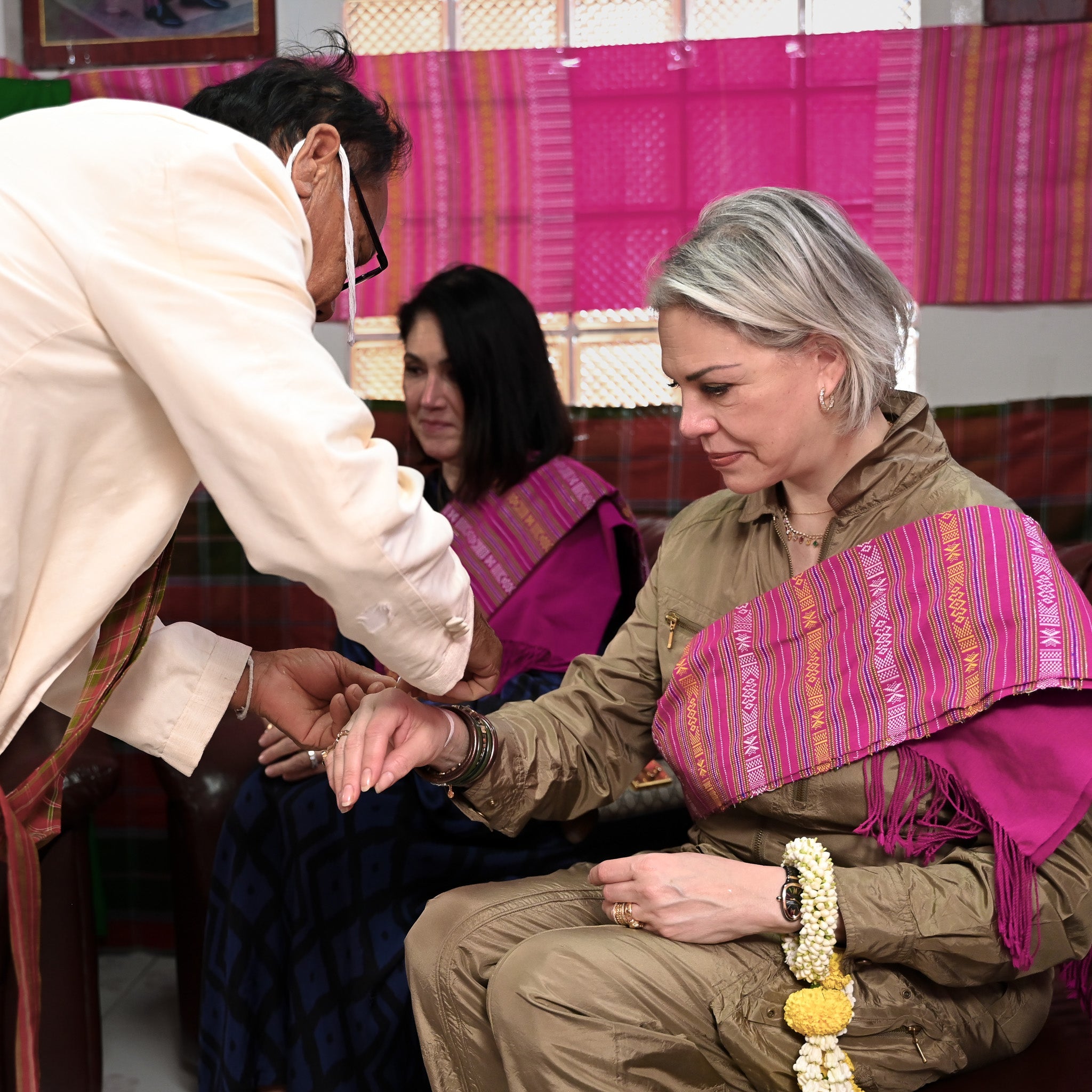 In a moment both personal and profound, the village elder ties the sacred sai-sin string around Jessica Jesse’s wrist—a gesture of protection, unity, and heartfelt blessing. For Jessica, this is more than ceremony. It is a deep acknowledgment of the artisans, families, and traditions that breathe life into every BuDhaGirl bangle.